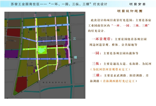 本次商住區(qū)亮化提升工程圍繞“一環(huán)、一園、三縱、三橫”進(jìn)行重點打造,燈光設(shè)計以“綠色的、生態(tài)的”為定位,不但要展示宿遷的城市特質(zhì),提升市民的自豪感和安全感,鼓勵周邊市民夜間步行,還將以現(xiàn)代科技之光區(qū)展現(xiàn)蘇宿園區(qū)騰飛的城市變遷。