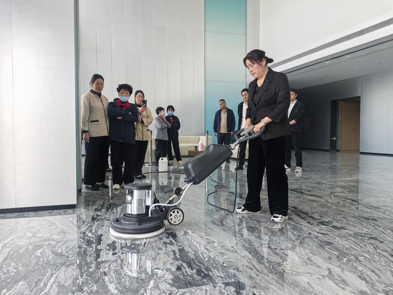 培訓(xùn)圍繞辦公大樓地面清掃、電梯轎廂清潔保養(yǎng)、玻璃幕墻清洗維護(hù)、會(huì)議室、茶水間及衛(wèi)生間細(xì)節(jié)處理到外圍路面和綠化區(qū)域的日常清理管養(yǎng)等內(nèi)容,通過觀看視頻和現(xiàn)場(chǎng)演示方式,詳細(xì)講解了操作規(guī)范和作業(yè)標(biāo)準(zhǔn),確保保潔人員能夠熟練掌握高效、科學(xué)的清潔技巧,提高工作質(zhì)量與效率。