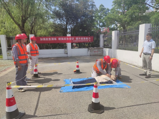 在園區(qū)為民河南閘站和利民河北閘站,分別模擬配電房火災(zāi)、維護(hù)人員觸電兩類典型事故場景開展應(yīng)急演練。針對電氣火災(zāi)事故,參演人員嚴(yán)格遵循應(yīng)急處置流程,依次完成切斷電源、報警聯(lián)絡(luò)、組織撤離、滅火器實操滅火等動作;針對觸電事故,則有序執(zhí)行斷電急救、撥打 120、心肺復(fù)蘇現(xiàn)場搶救等規(guī)范操作。兩類演練均以 “模擬事故 — 響應(yīng)處置 — 流程實操” 為脈絡(luò),使維護(hù)人員系統(tǒng)掌握不同事故的處理流程與協(xié)作要點,切實提升應(yīng)急處置的規(guī)范性與團(tuán)隊配合效率。