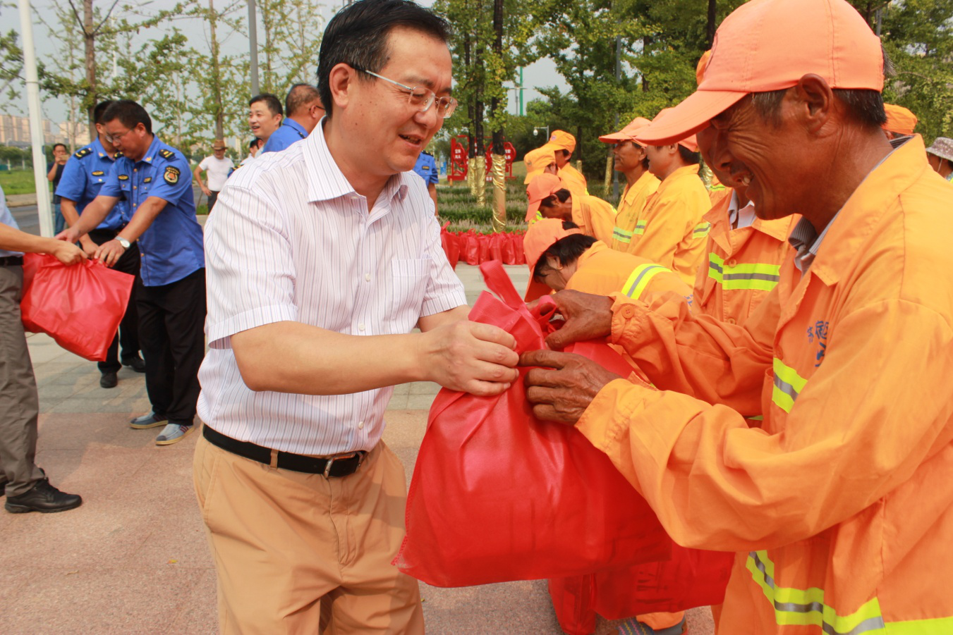 在慰問(wèn)現(xiàn)場(chǎng),馮建林與工人們親切握手,并將毛巾、人丹、藿香正氣水等防暑降溫用品送到工人手中,讓他們感受到烈日酷暑下的一片清涼。馮建林對(duì)城維工人戰(zhàn)高溫、抗酷暑、勇于奉獻(xiàn)、堅(jiān)守崗位的精神給予充分肯定和贊揚(yáng),對(duì)他們?yōu)閳@區(qū)所付出的辛勤勞動(dòng)表示衷心感謝。他叮囑大家在夏季高溫時(shí)段要注意休息,勞逸結(jié)合,確保自身安全。